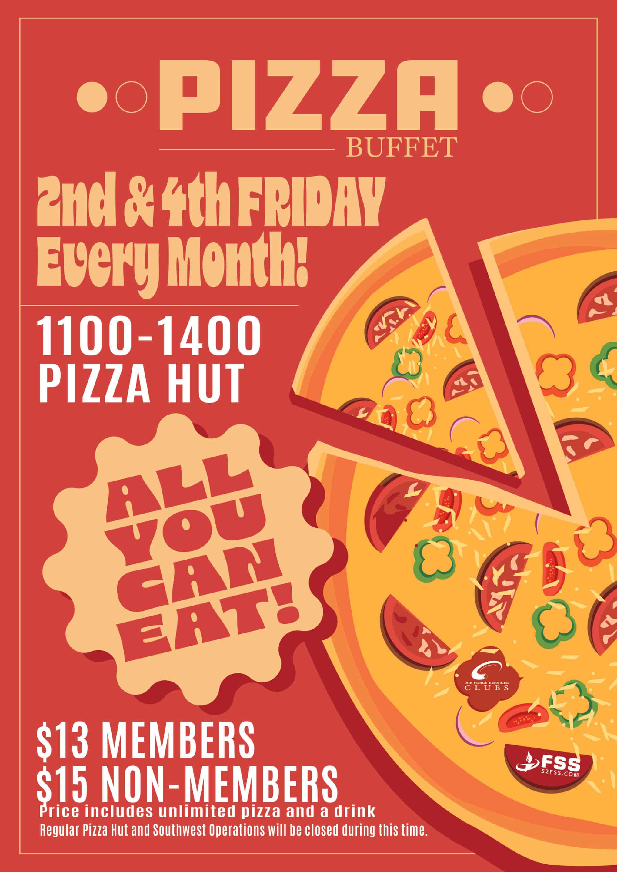 Every 2nd and 4th Friday of the week, dive into a delicious Pizza Buffet featuring all your favorite toppings, styles, and cheesy goodness! Whether you’re classic pepperoni or adventurous veggie, there’s something for everyone. Grab a plate, go back for seconds (or thirds), and enjoy the fun!
